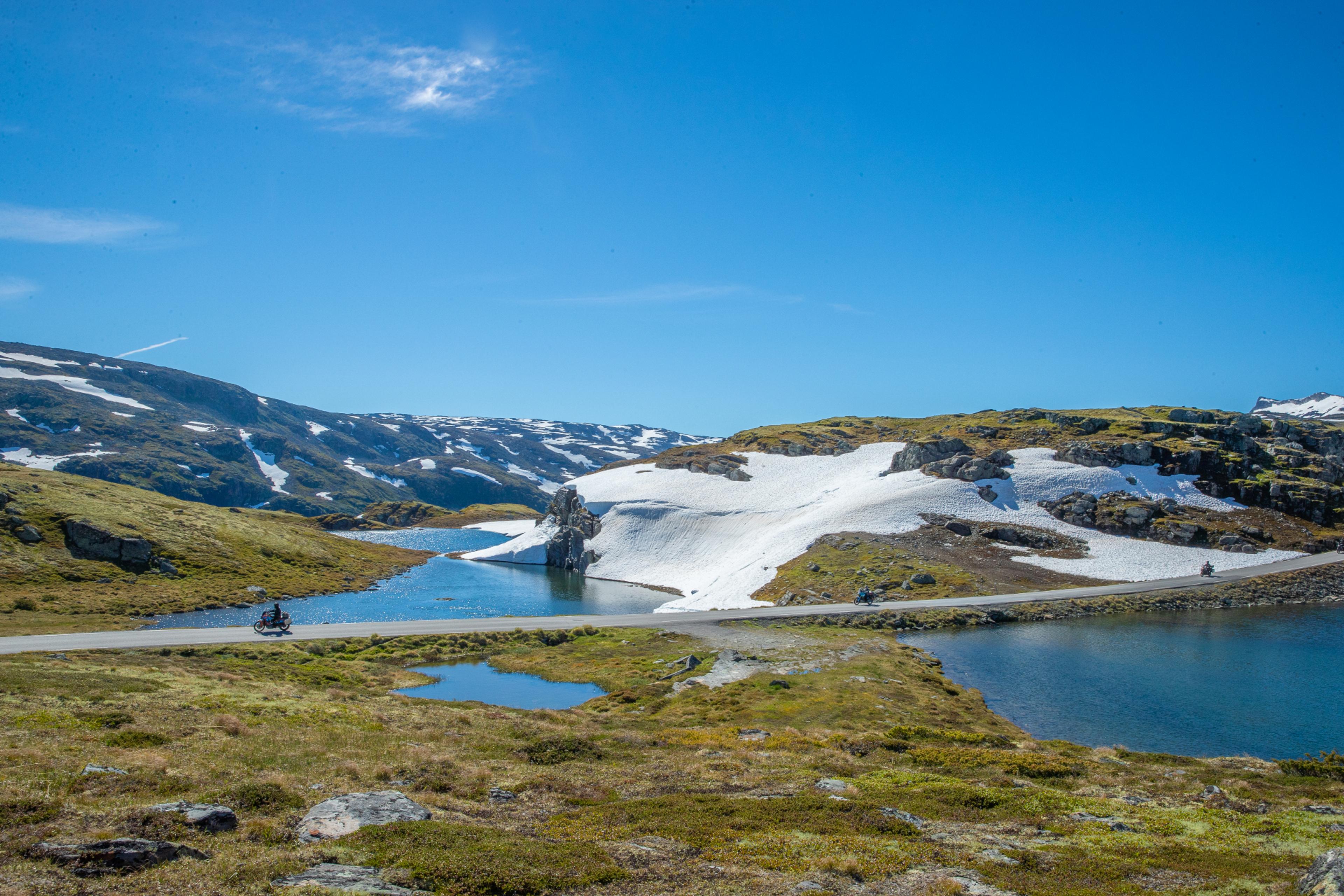 Be ready for contrasts when driving this route. It goes from fjord to fjord over a mountain pass where the highest point on the route being 1308 masl.