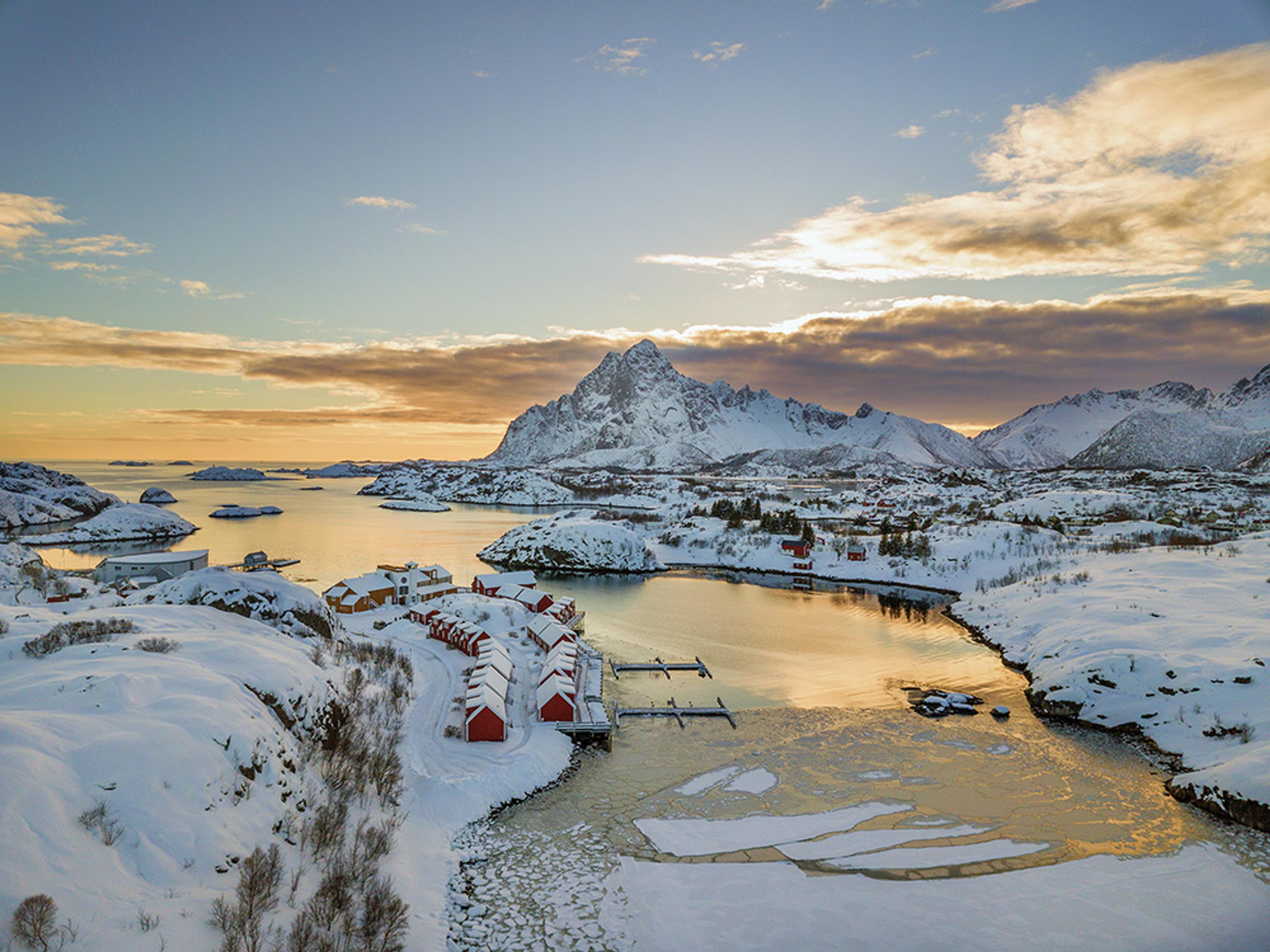 Cerca del extremo más occidental del archipiélago de Lofoten encuentras Reine Rorbuer. Es el hotel más pintoresco que puedas imaginar, compuesto por 39 cabañas tradicionales de pescadores. A solo unos pasos puedes disfrutar de la espectacular naturaleza de aquí, que se balancea entre ser serena y brutal. Explora Reine y sus alrededores en kayak, bicicleta o a pie, ve a pescar o simplemente relájate ante las hermosas vistas desde tu “rorbu”.