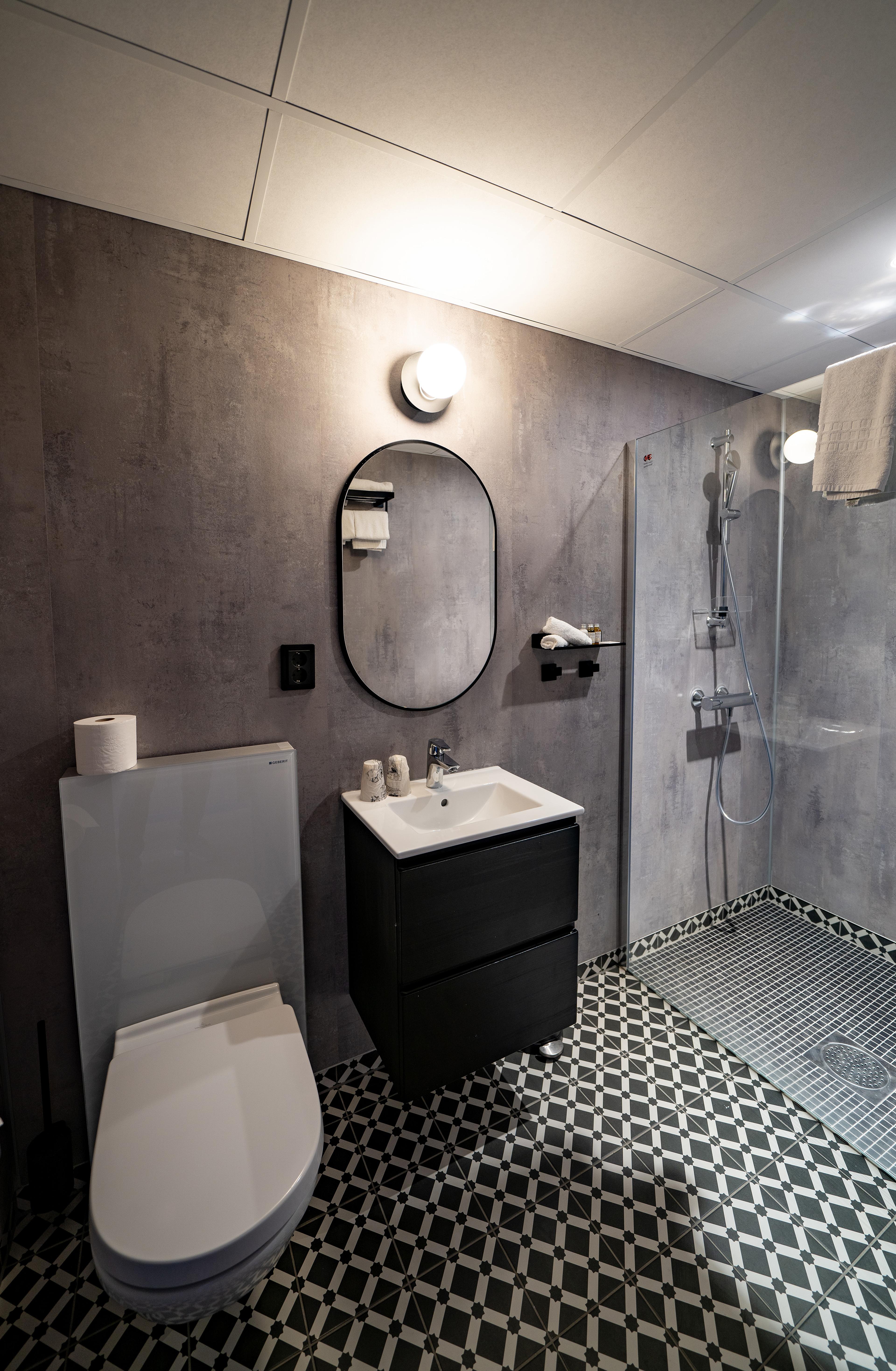 The rooms have 2 single beds put together to form a double bed, and a balcony. View towards the fjord. Bathroom with shower. The room does not have a TV.