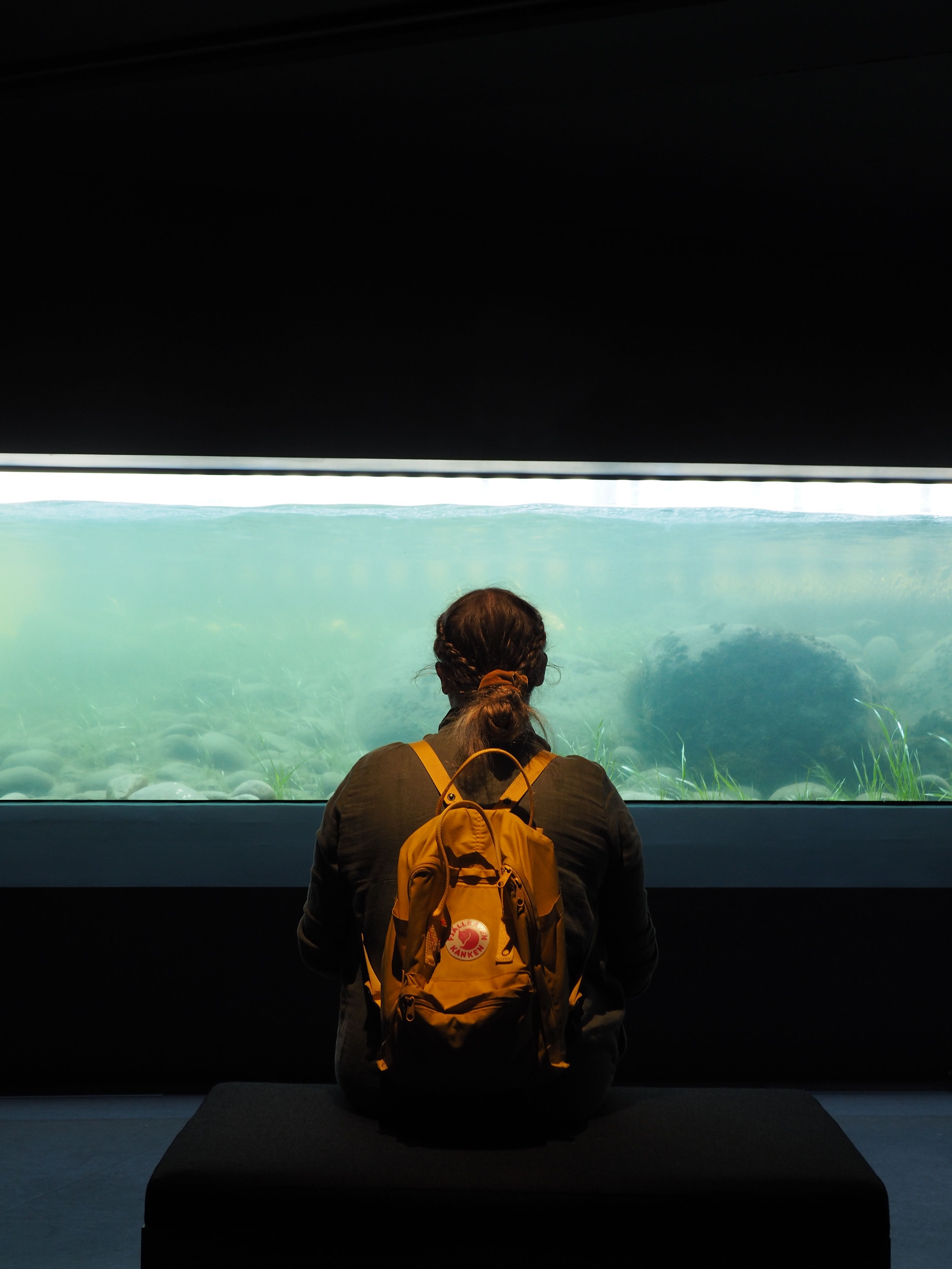 Dentro de la exposición, puedes seguir al salmón a través de su crianza en el río, su migración hacia el océano, de regreso al fiordo y subiendo por su afluente hasta que se encuentra con la cascada que no puede superar.