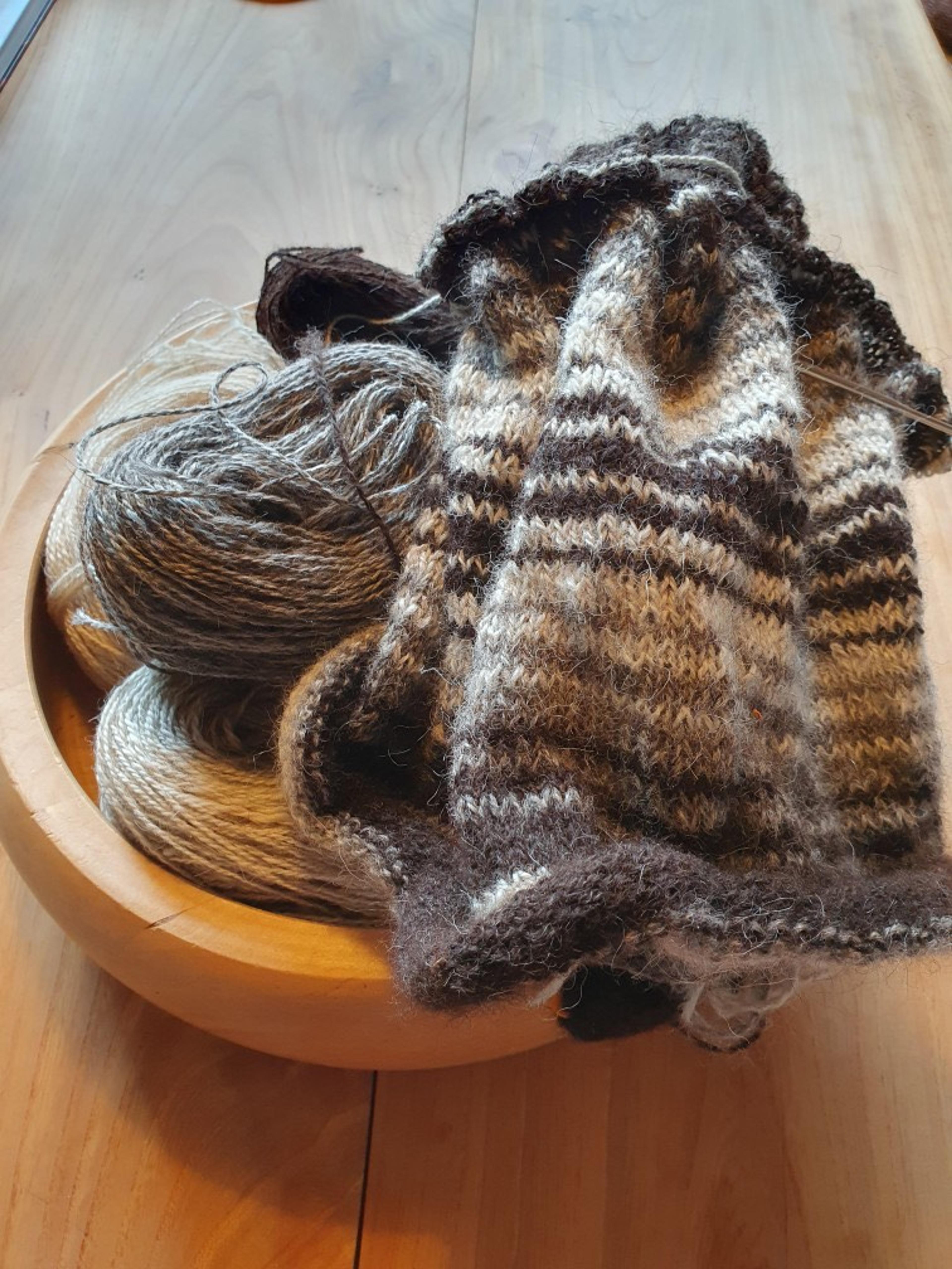 Øvre Hove gard frå Vik i Sogn har garn frå eigne villsauer, i 4 naturfargar som kan brukast til å tove fine vottar og strikka mykje fint.