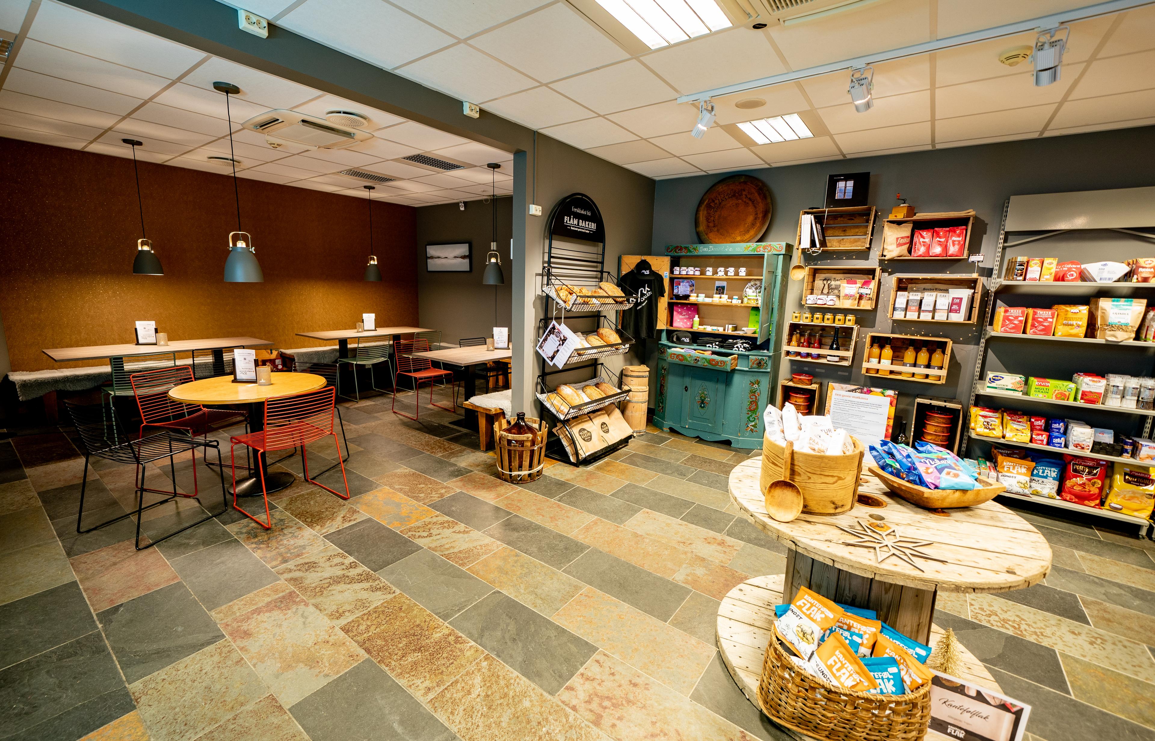 Kaféen rett ved sida av billettkontoret er kjent for sine nysteikte vafler, bollar og sandwichar. Har du medbrakt niste er du velkomen til å eta den her.