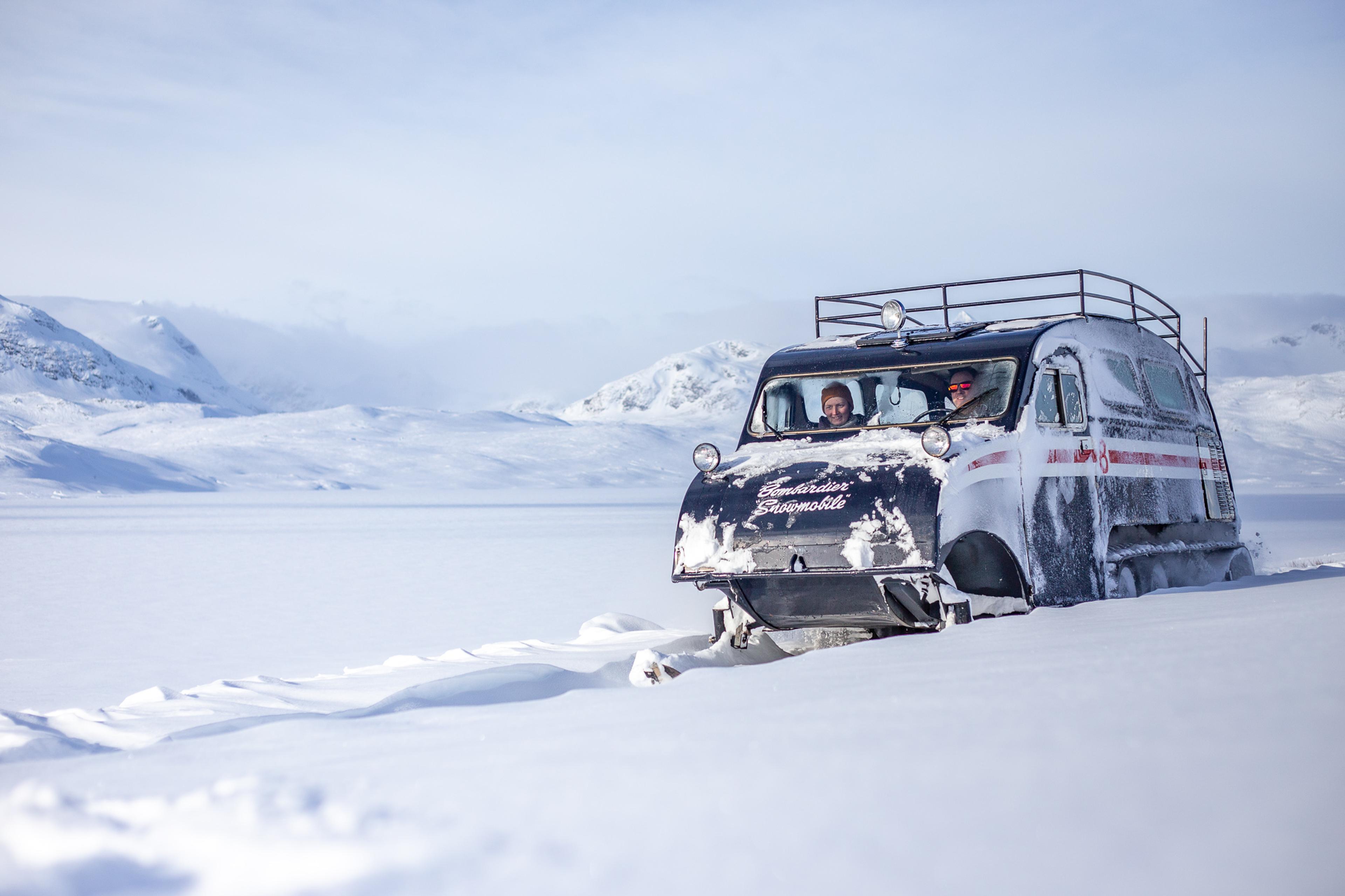 Bli med på en spektakulær beltebiltur med lunsj og truger – en eksotisk opplevelse og den eneste vinterforbindelsen mellom Eidsbugarden og Tyin. Velg om du vil bestille med eller uten busstransport fra Flåm!