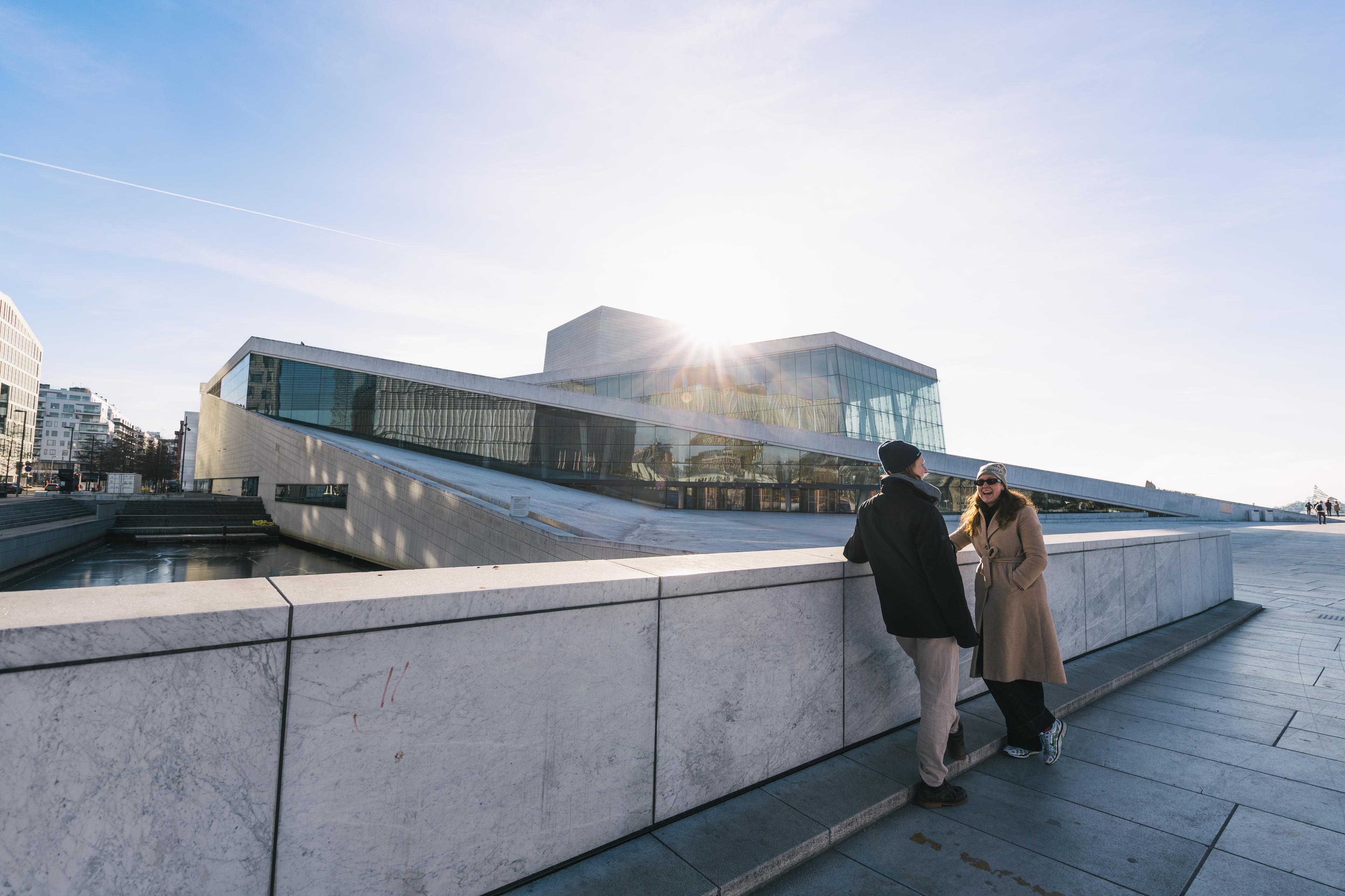 Neste stopp er Operahuset, et av Oslos mest ikoniske moderne landemerker. Dette er et sted du må få med deg – både innvendig, utvendig og på toppen. Ja, du kan faktisk gå rett opp det skrånende taket for å få panoramautsikt over byen og fjorden. Herfra kan du ofte se Fjord Cruise-båten som ligger til kai på Langkaia rett nedenfor.