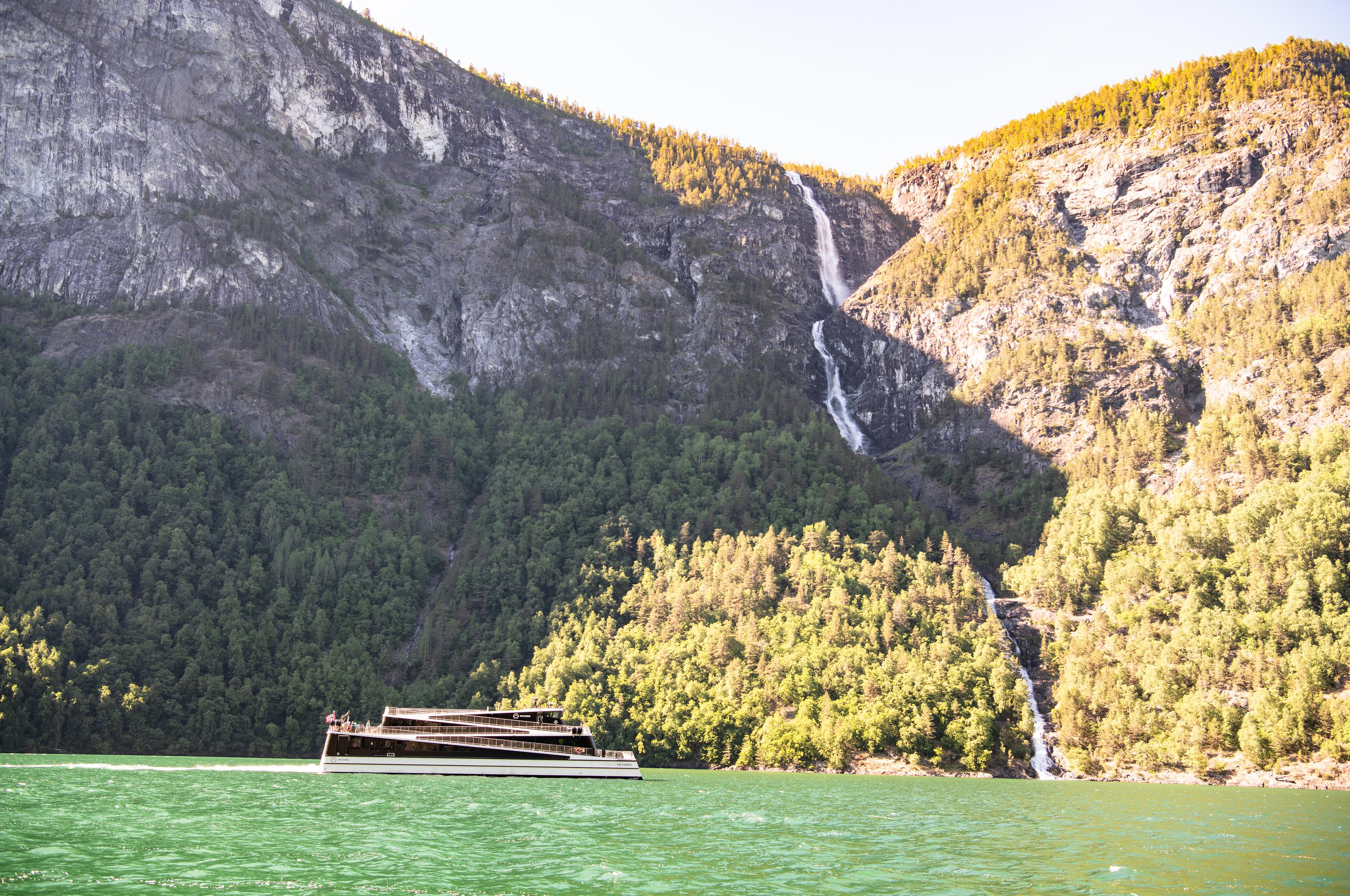 Ro ned og pust ut. Om bord på Fjord Cruise Nærøyfjorden kan du lene deg tilbake og nyte utsikten til verdensarvfjorden, de koselige små bygdene og den spektakulære naturen. Eller du kan gå av underveis for å utforske området på nært hold. Den korresponderende skyttelbussen tar deg tilbake til utgangspunktet, enten du starter i Gudvangen eller Flåm.