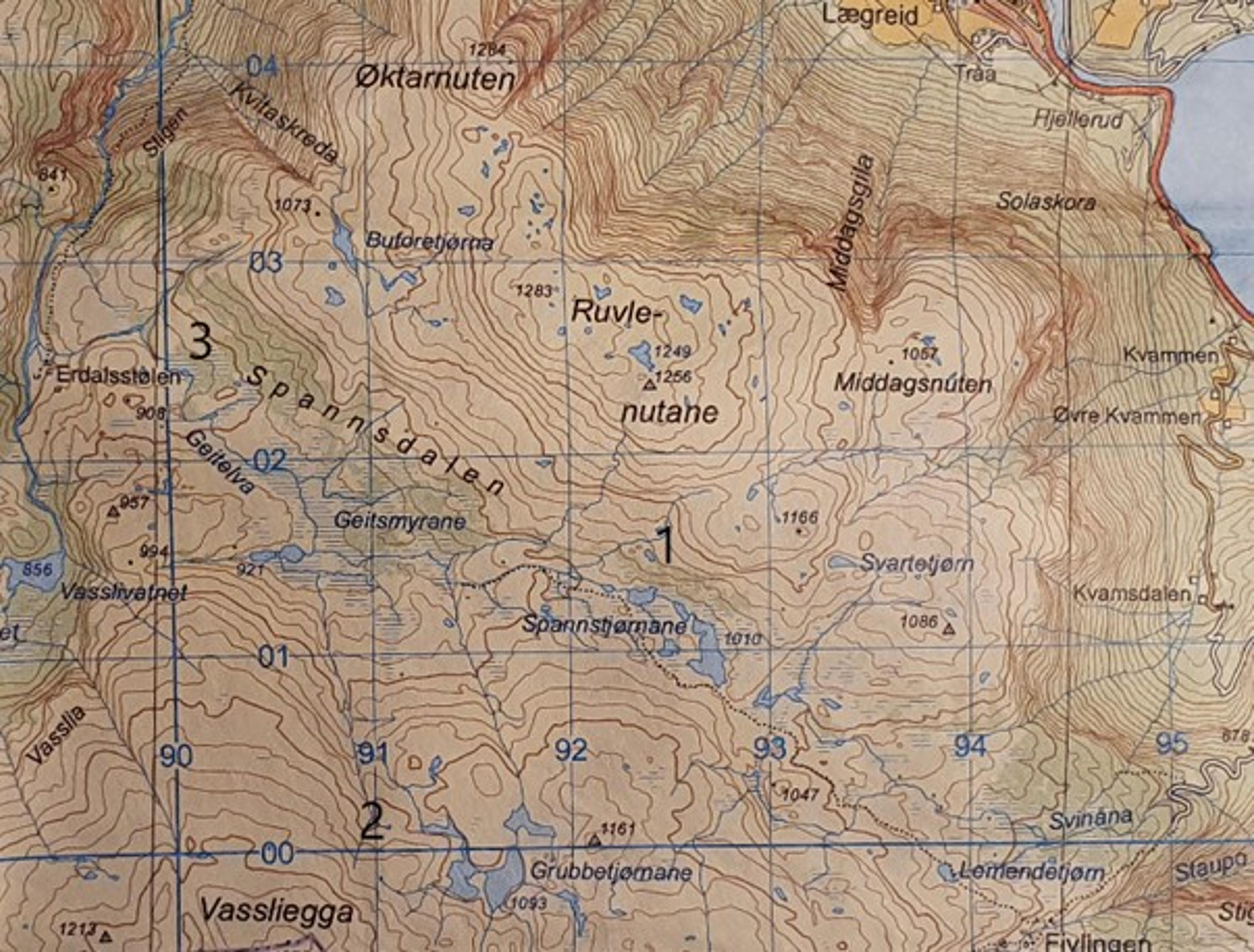 3. Ruten der tallet 3 står forteller oss noe interessant om terrenget. Vi ser at deler av terrenget er markert med grønt, og at andre områder er tegnet i hvitt/beige. Det grønne er vegetasjon, altså trær eller skog. De hvite områdene er uten skog. Sammen med opplysninger om høyden over havet (ca 900 meter), får vi vite at det vokser skog i de sørvestvendte liene i Spannsdalen, selv opp til ca 1000 meter. Det tyder på at dalføret trolig er skjermet for den verste vinden og har et relativt behagelig klima. Det er nyttig å vite dersom vi trenger ved til bålet, ly for vinden eller vil jakte rype.