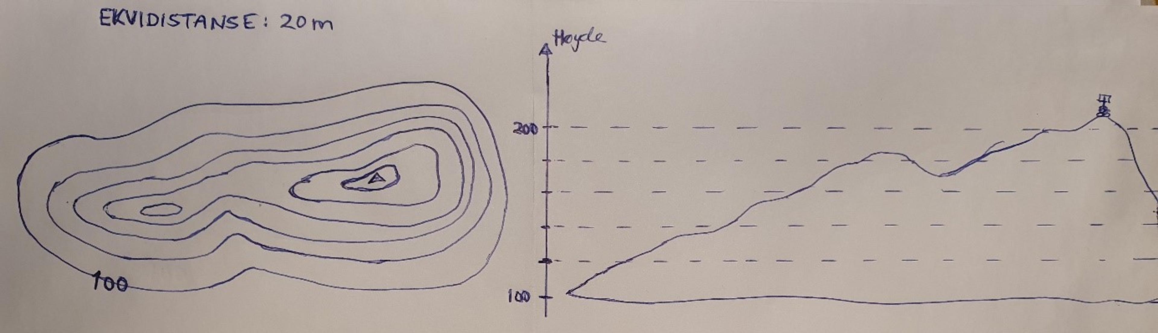 Ekvidistanse er begrepet som brukes for å si noe om hvor stor høydeforskjell det er mellom to høydekurver på et kart. En ekvidistanse på 20 meter betyr at det er 20 meter høydeforskjell mellom to høydekurver. Vær klar over at hvert punkt på samme høydekurve er like høyt over havet. På figuren til venstre har jeg notert høyden på den nederste høydekurven: 100 meter. Jeg er like høyt over havet hvis jeg vandrer rundt åsen og holder meg på denne kurven hele tiden.
