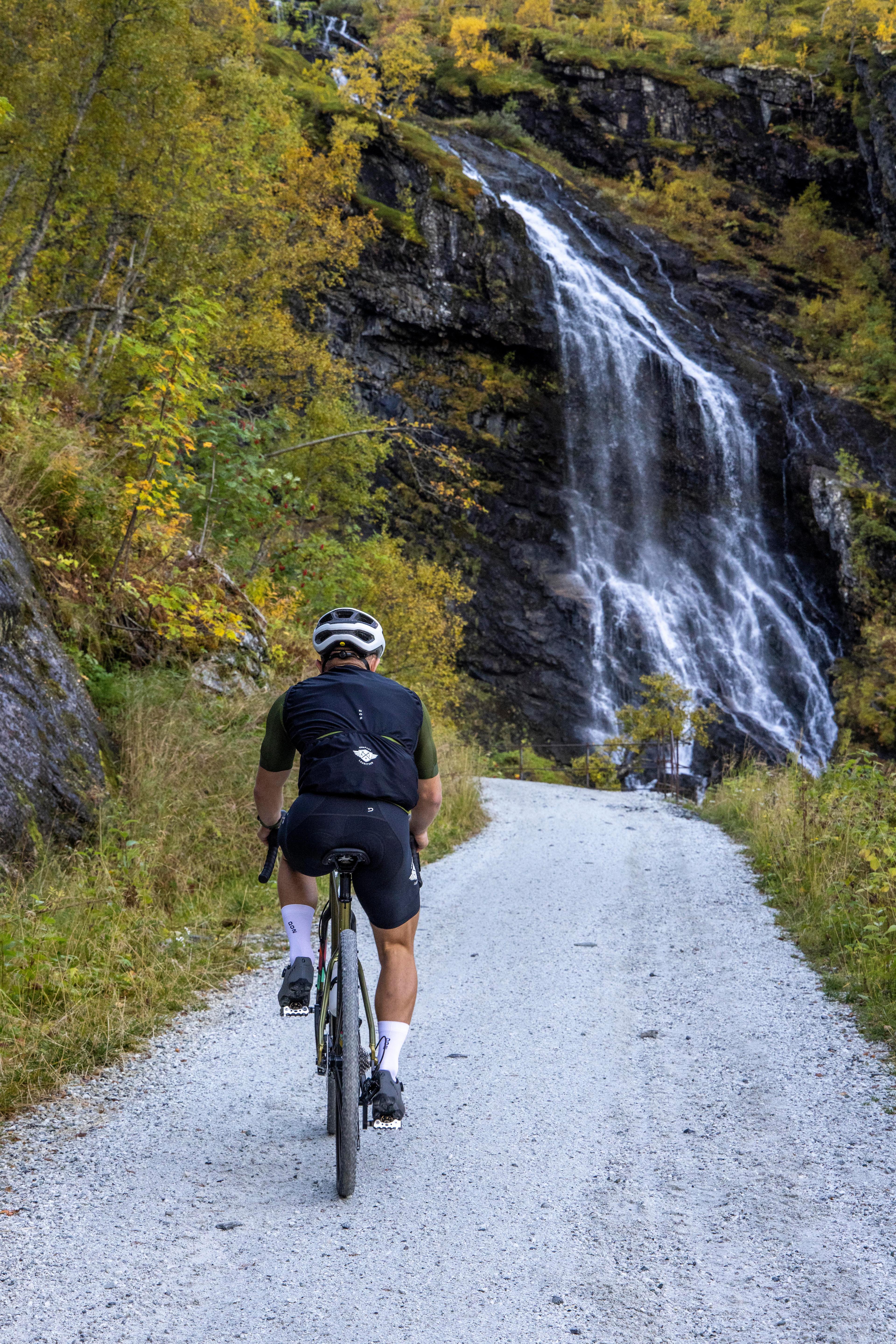 Men selv om etappen er fysisk krevende, virker det heldigvis som det nasjonalromantiske landskapet bidrar til å holde motivasjonen oppe blant deltakerne. For hver meter de legger bak seg, åpner det seg nye, spektakulære syn – fossefall, elver og fjell som strekker seg oppover dalen.