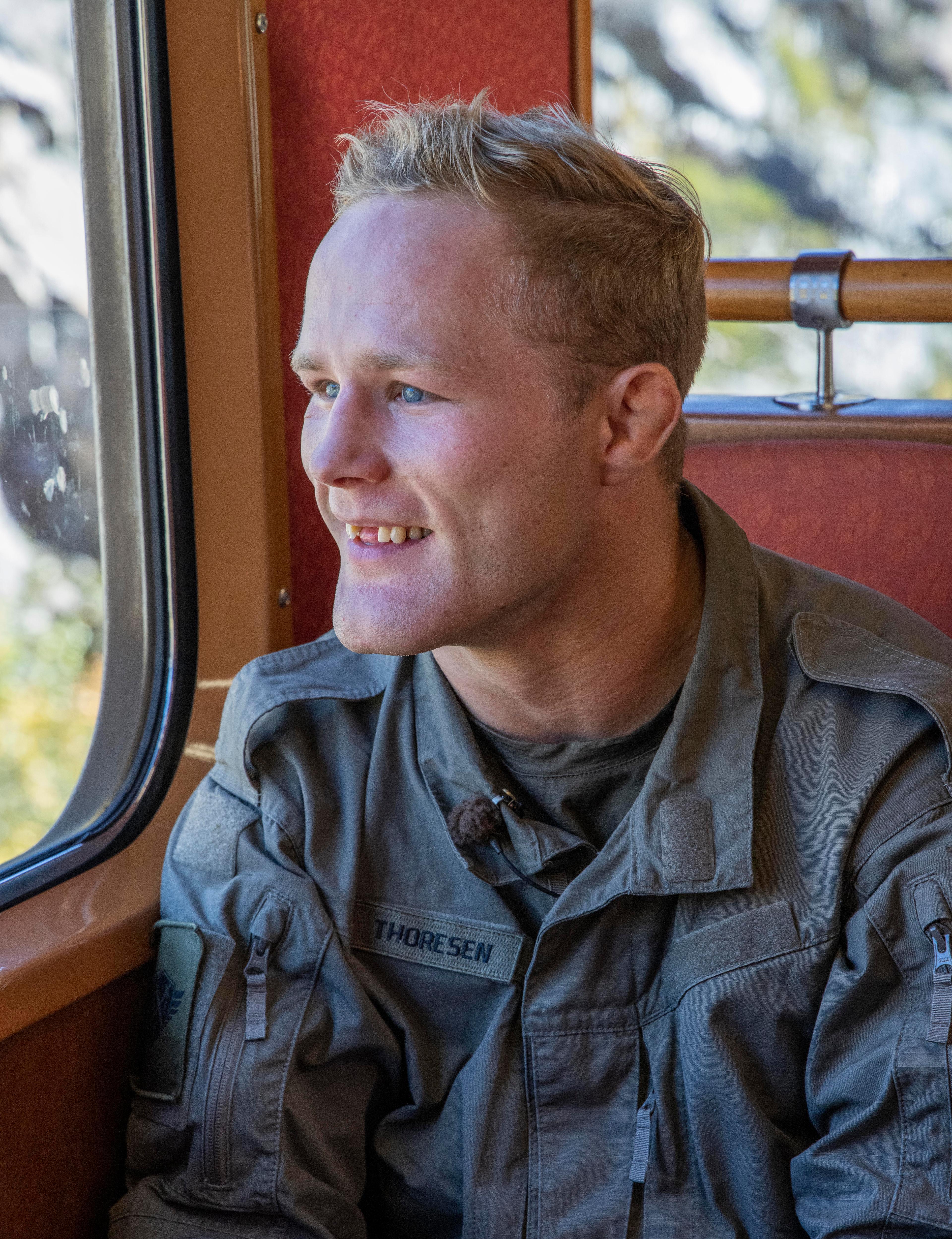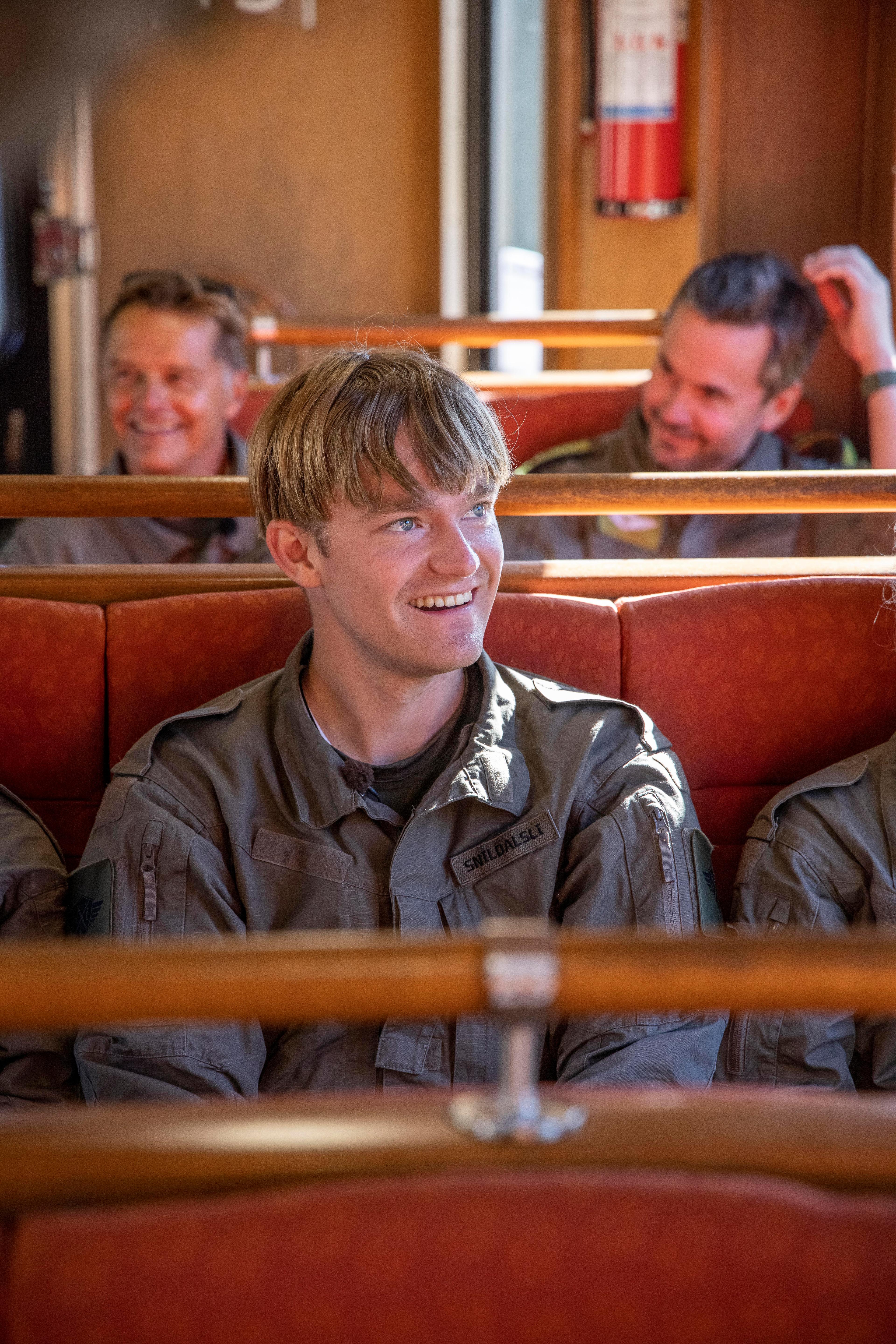 Om bord på toget får deltakerne et helt nytt perspektiv. Gjennom vinduene ser de ned på den bratte ruta de nettopp har syklet, omgitt av fossefall, steinurer og frodige dalsider. «Det der er som Flåklypa!» bryter Thoresen ut, mens landskapet glir forbi.