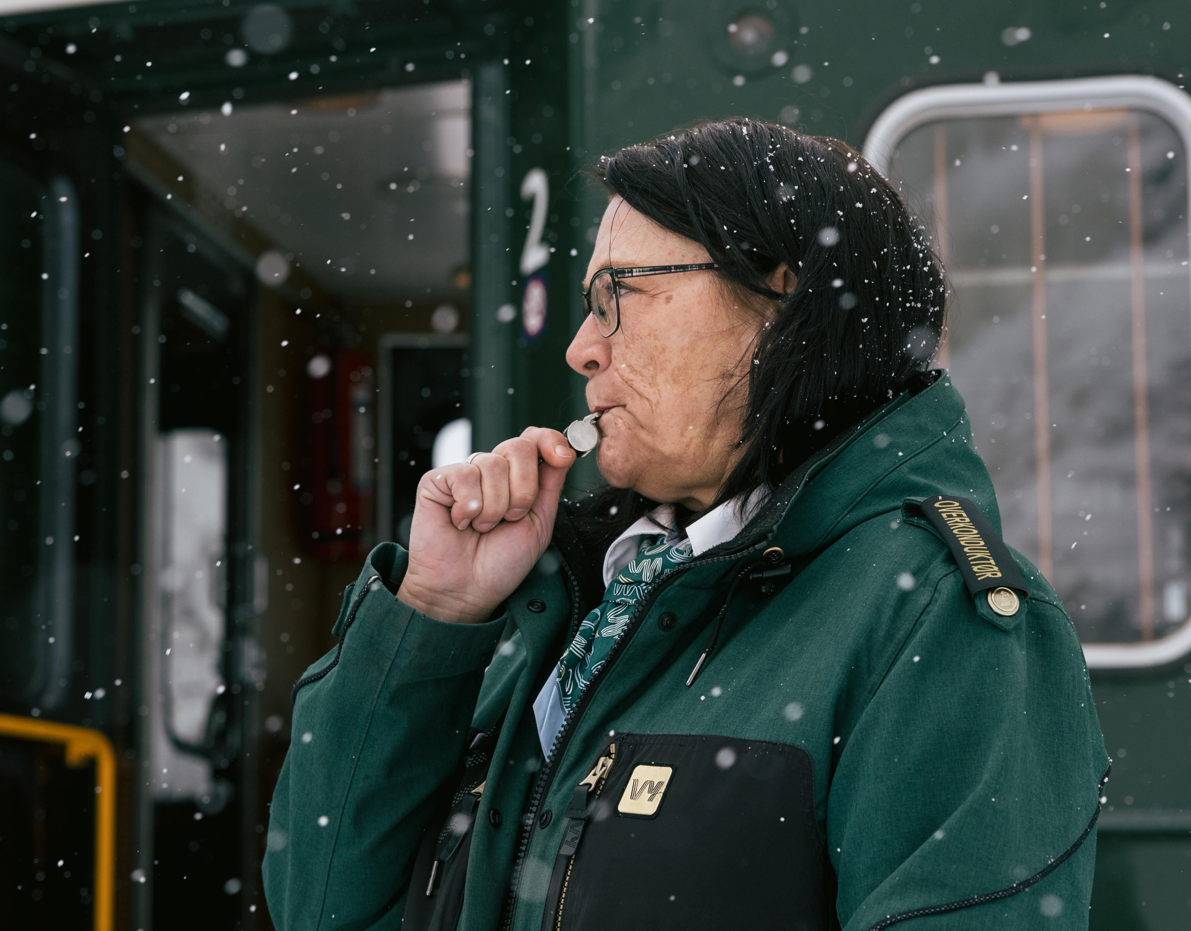Tid kan være krevende, spesielt ved populære Kjosfossen, der passasjerene forlater toget for å nyte utsikten. «Vi må ofte blåse i fløyta flere ganger for å få folk om bord igjen» ler hun.