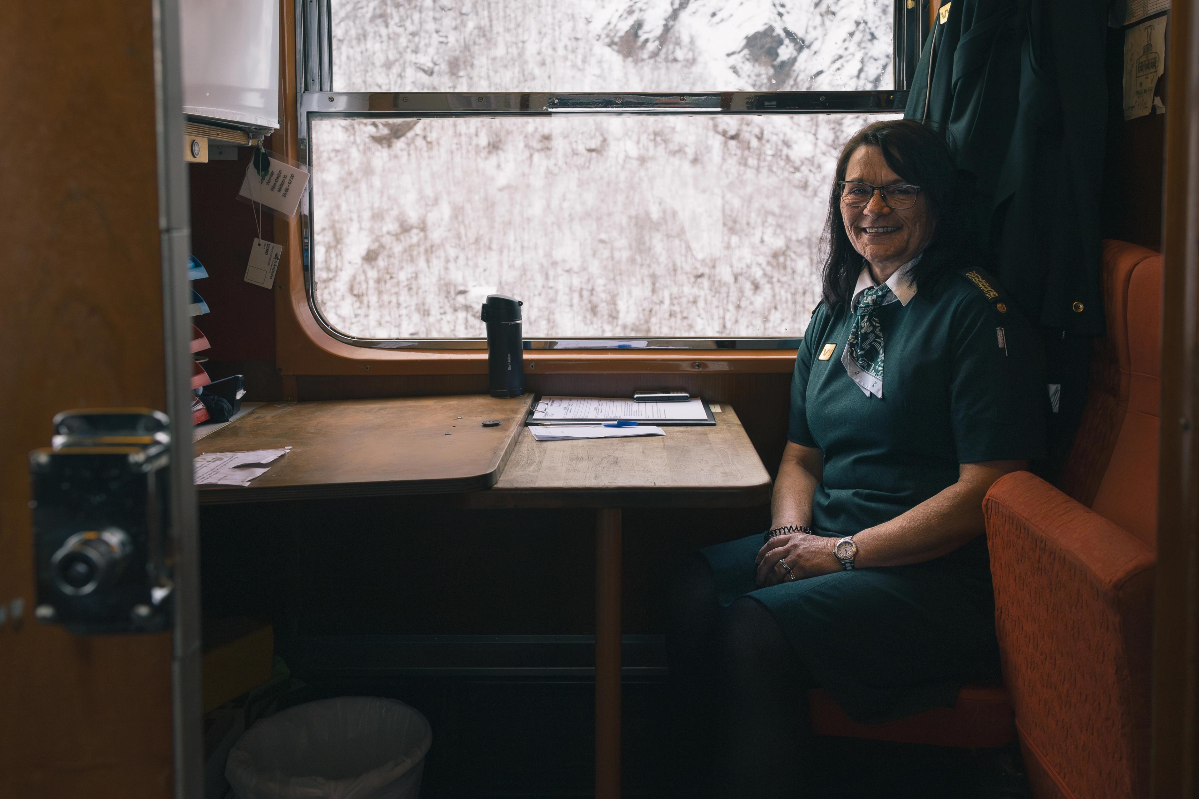 Siw jobber fra det lille kontoret sitt i konduktørvogna, men er alltid tilgjengelig for passasjerene når de trenger henne. «Jeg føler meg veldig trygg i jobben min, og det gjør at jeg kan slappe av og svare på spørsmål og det som trengs» sier hun.